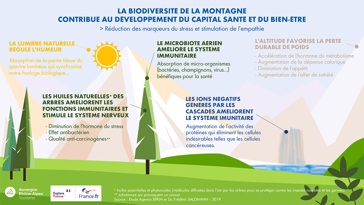 Une étude sur l'impact de la montagne sur la santé humaine : altitude, conifère, cascade... réalisée en 2019 par l'agence SPRIM et le Dr Saldmann pour la Région AURA, fait ressortir les impacts positifs de la montagne sur l’allongement de la durée et de la qualité de vie :